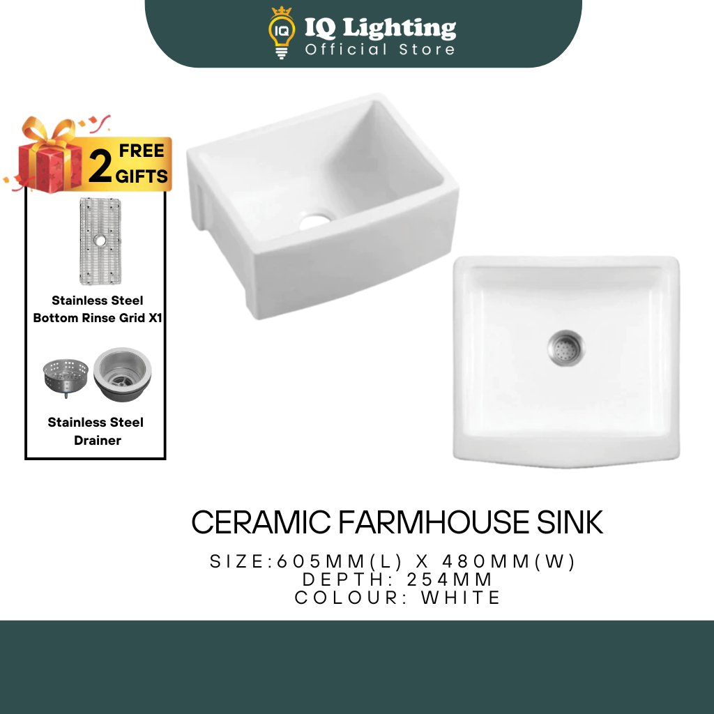 Ceramic Farmhouse Kitchen Sink 605mm Single Bowl Handmade Ceramic Sink Fireclay Reversible Farmhouse Apron-Front Kitchen
