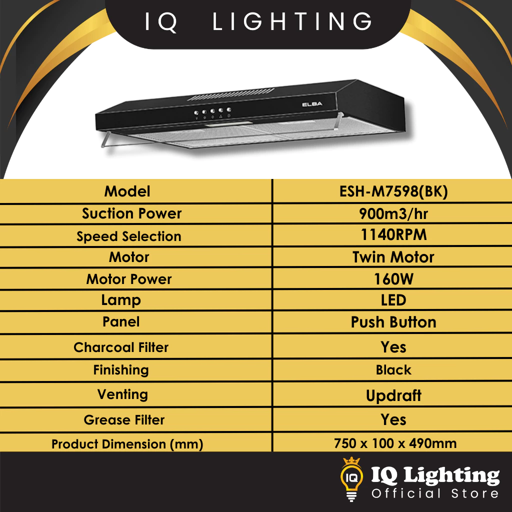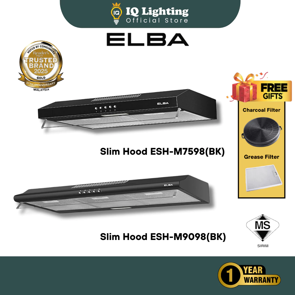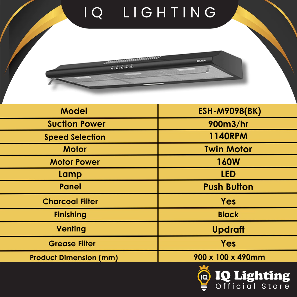 ELBA Slim Hood ESH-M7598(BK) / ESH-M9098(BK) – Twin Motor, Twin Blower (Suction Power : 900m³/hr)