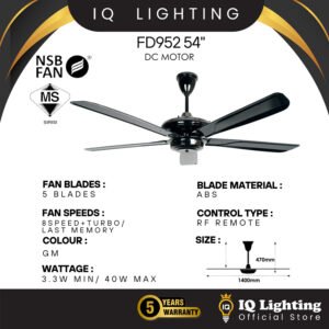 NSB Classic Fan FD952 Powerful DC Motor 54” Ceiling Fan 5 Blades With Remote Control 8 Speed + Turbo / Kipas SilingTurbo