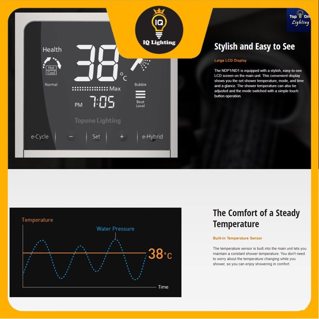 The NDP1/ND1 is equipped with a stylish, easy-to-see LCD screen on the main unit. This convenient display shows you the set shower temperature, mode, and time at a glance. The shower temperature can also be adjusted and the mode switched with a simple touch button operation.