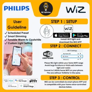 1 year warranty by Philips Malaysia. All Wiz LED products have a lifetime of 15,000 hrs