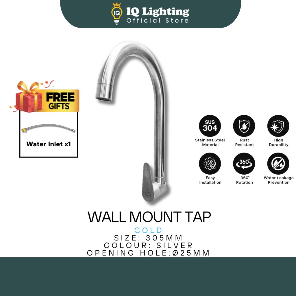 Stainless Steel SUS304 Wall Mount Kitchen Water Tap Sliver Cold Water Faucet 300mm (H)