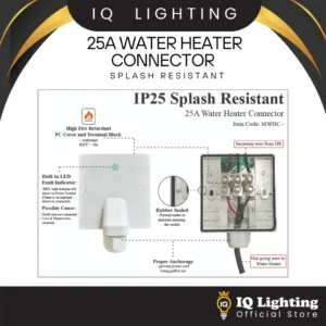 25A Water Heater Connector – approved by Suruhanjaya Tenaga and SIRIM tested, in compliance with Malaysia’s national wiring standards, this splash-proof and fire retardant junction box securely powers up your water heater.